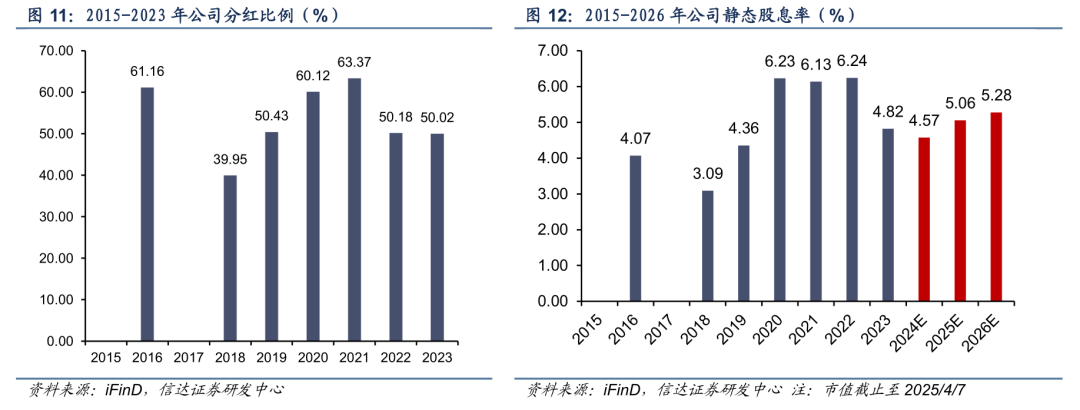 高分成高股息属性迥殊,分成欢跃延期三年。公司喜爱股东报恩,2024 年4月,公司发布《公司改日三年(2024-2026 年)分成计较》,欢跃分成比例不低于归母净利润的50%,咱们瞻望2024-2026年股息率为4.57%、5.09%、55.31%。