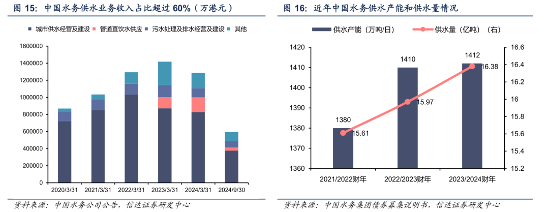 公司水价低于宇宙平均水平,有望受益于宇宙水价趋势性高涨。中国水务给水联想本事整个为1412万吨/日,其中在运838万吨/日,在建169万吨/日及计较中的404万吨/日。限度2023/2024财年末,下属60家自来水公司的总体平均水价为2.11元/吨,连年来公司多个名堂场地地上调水价,公司平均售水价钱呈现上升趋势。