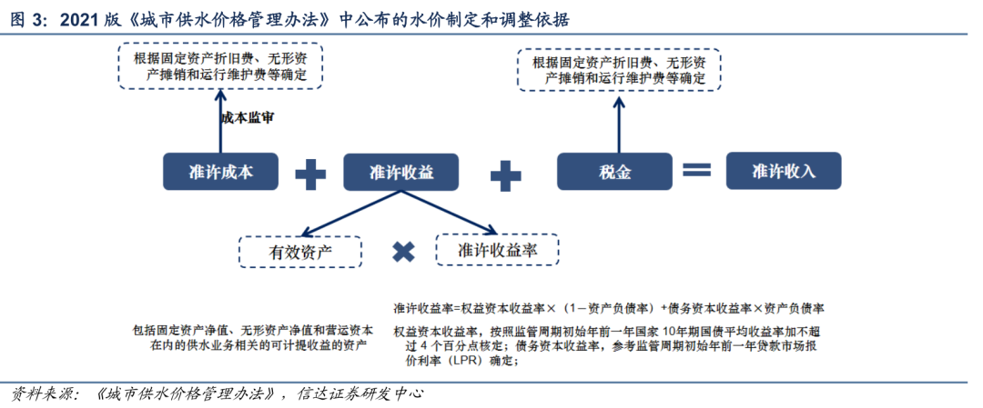 新政出台明确水价调价周期。2021年新版《城市给水价钱贬抑办法》出台,规矩给水企业的准许收入由准许成本、准许收益和税金组成,顺从“准许成本加合理收益”原则。
