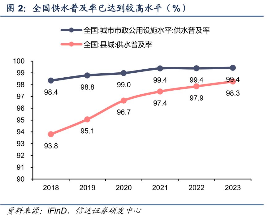 城镇、县城给水普及率约99%,改日量增空间有限。宇宙给水产能从2006年的3.12亿吨/日加多至2023年的4.08亿吨/日,年复合增速为1.4%,产能限度总体上趋于踏实。2023年宇宙城市给水普及率达到99.4%,县城给水普及率为98.3%,一经到达发展天花板。改日给水彭胀的增量空间有限,对于自来水企业,收益加多或主要来自水价提涨和运营贬抑成果的莳植。